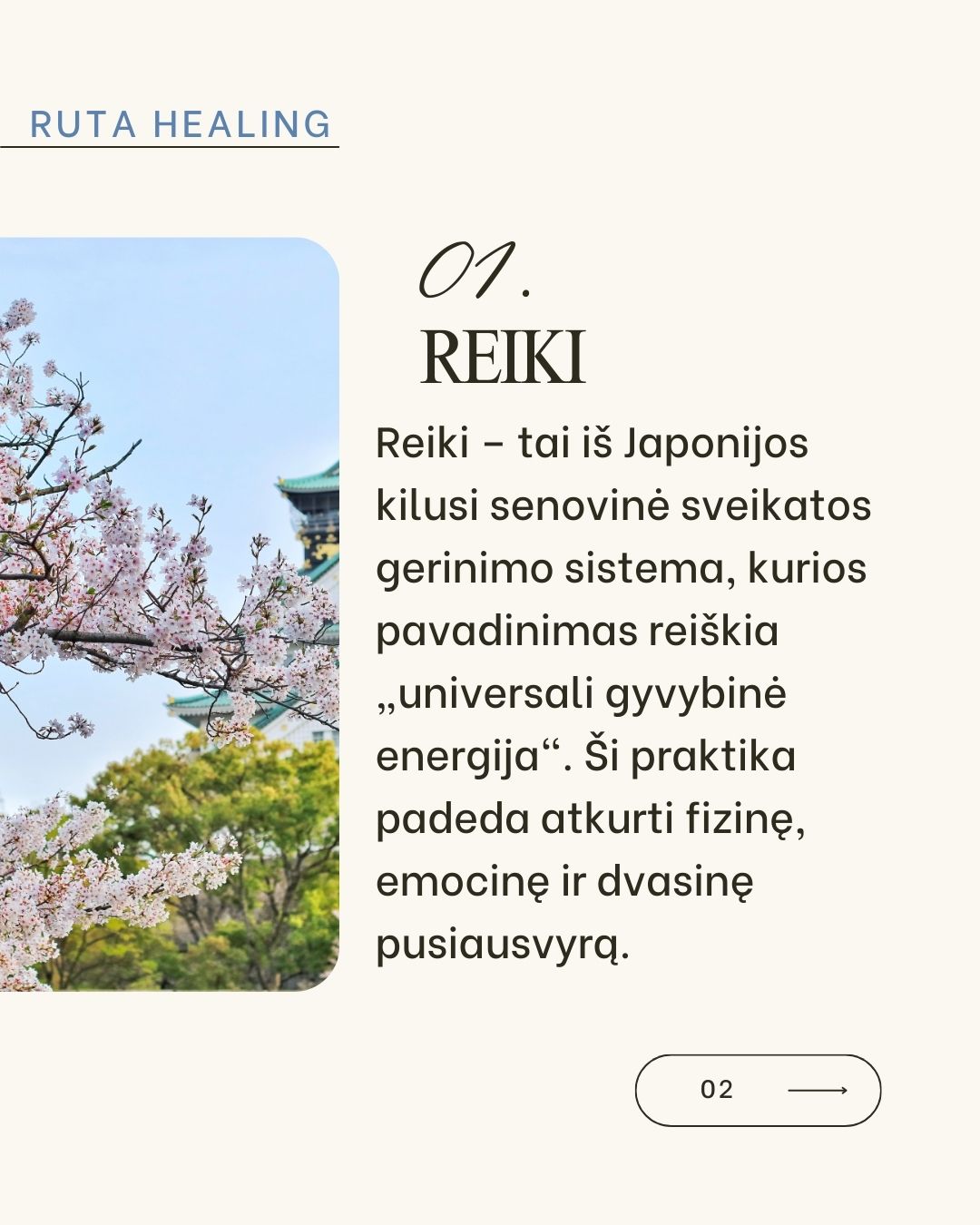 Reiki - tai švelni savireguliacijos praktika, kilusi iš Japonijos, padedanti nuraminti nervų sistemą ir atkurti vidinę pusiausvyrą. Ji veikia per sąmoningą dėmesį, prisilietimą arba nuotolinį darbą su energija, leidžiant kūnui ir protui grįžti į natūralią ramybės būseną.